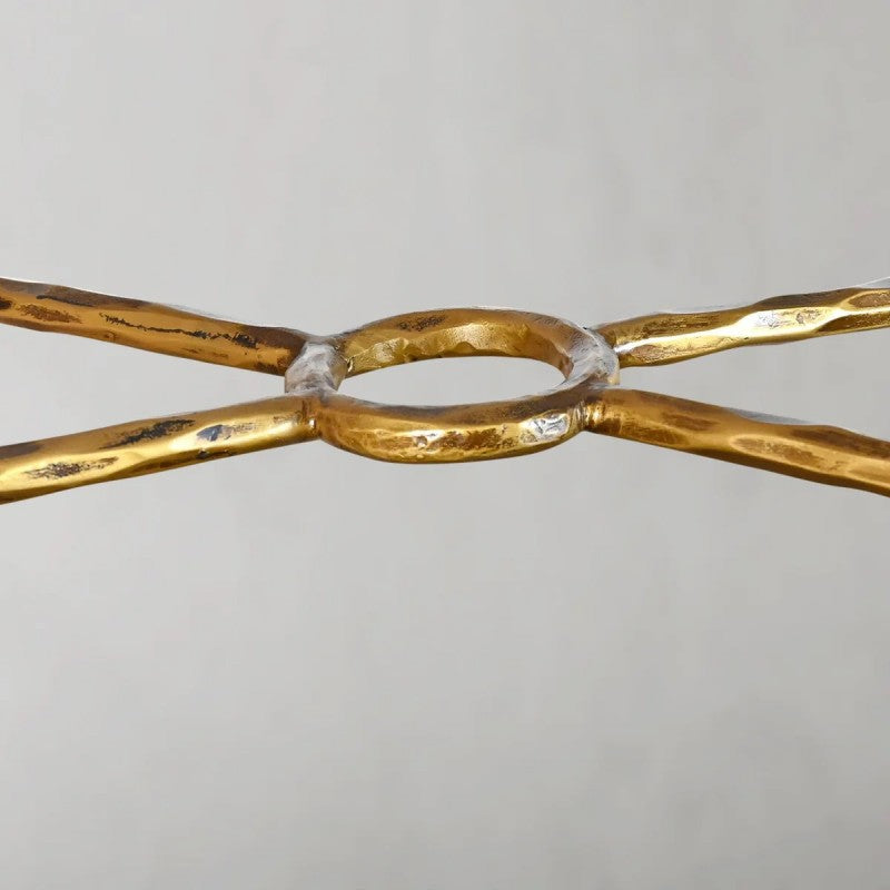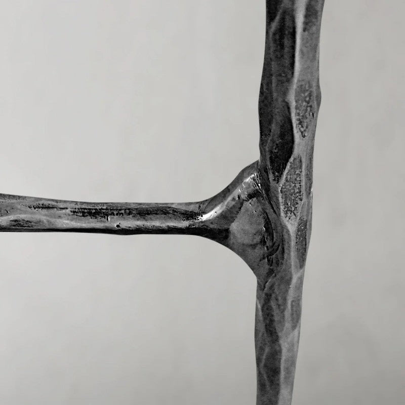Our collection by the rustic sensibility of hand-forged metal with clean tempered glass. Employing an ancient fabrication process, artisans hand hammer the metal bars to reveal an alive, imperfect and organic texture. The pounded, tapered silhouettes are a rich counterpoint to the smooth, honed stone.