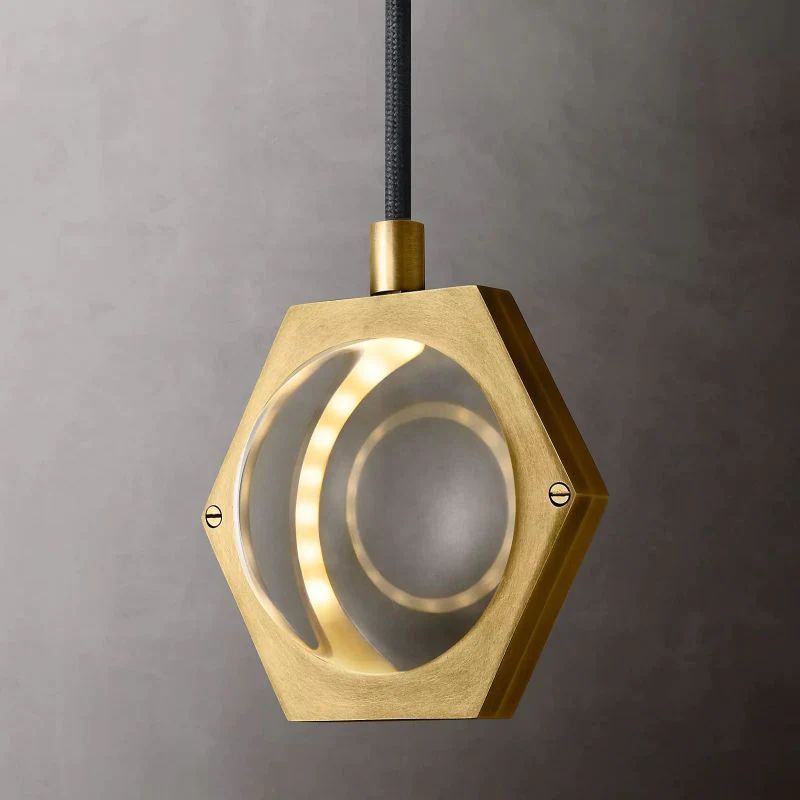 The collection features lighted crystal orbs, suspended in hexagonal fittings within a flat metal frame. The design was inspired by plans for the cenotaph of Sir Isaac Newton drawn by 18th-century architect Etienne Louis Boullée, a visionary ode to physics reinterpreted in a stunning contemporary form.