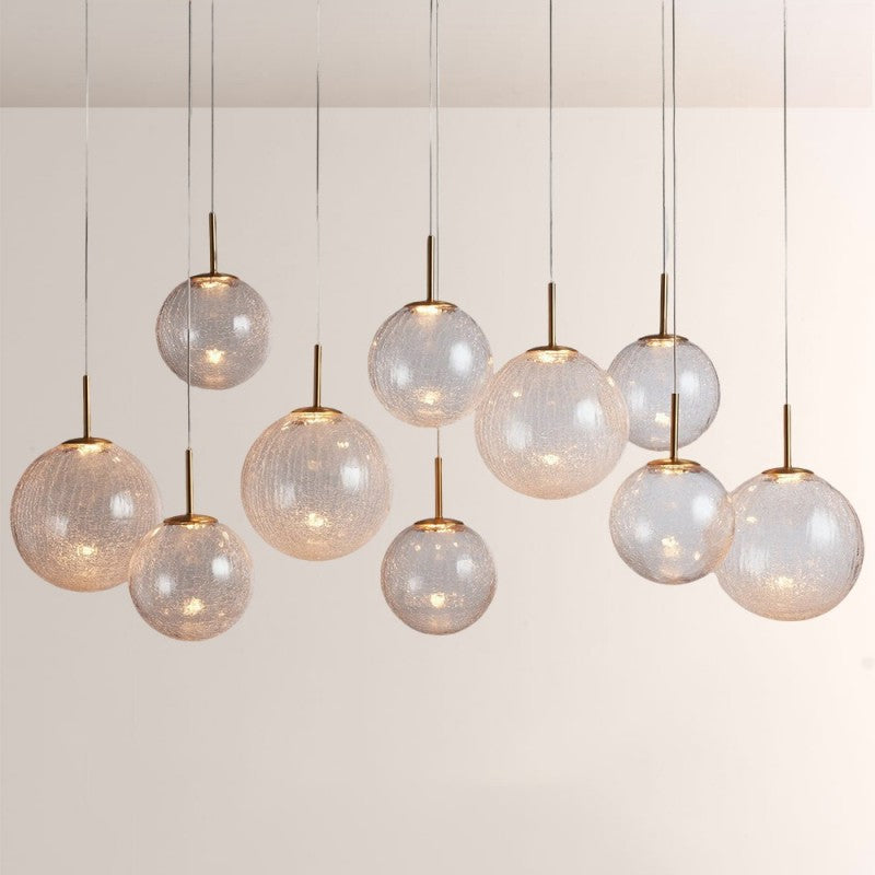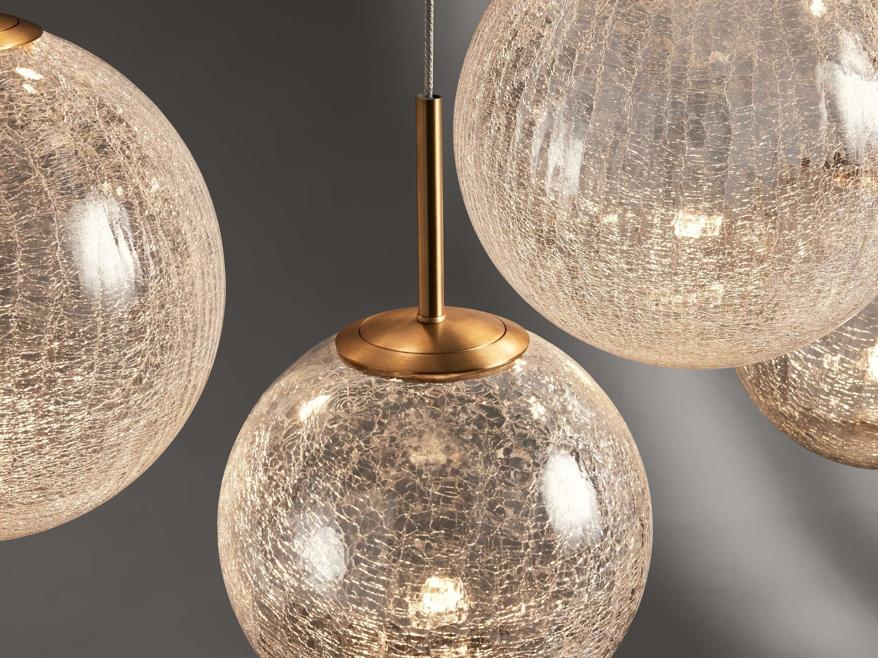 Expertly crafted glass globes drop from modern satin brass hardware in our Casen Lighting Collection. Each globe is mouth blown by our artisan partners and features an integrated LED light that illuminates the glass from within to enhance every natural crackle and bubble detail—bringing a unique, organic touch into your home.
