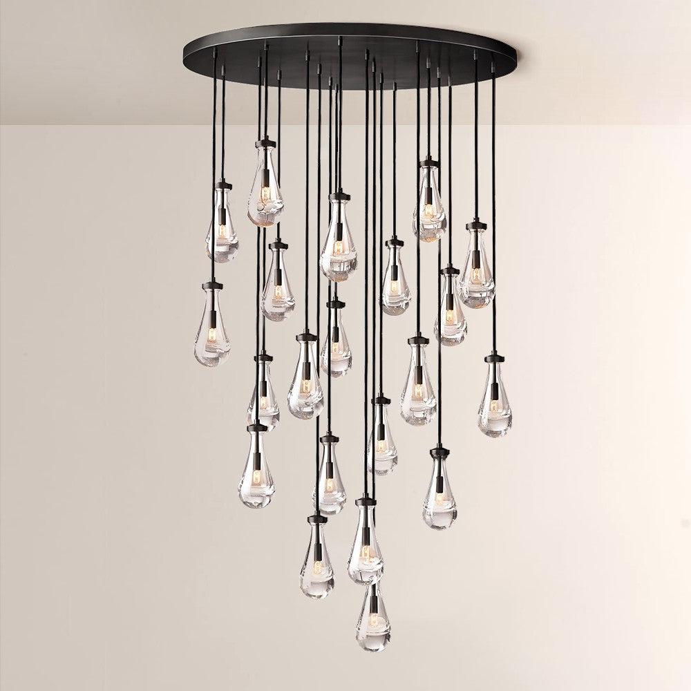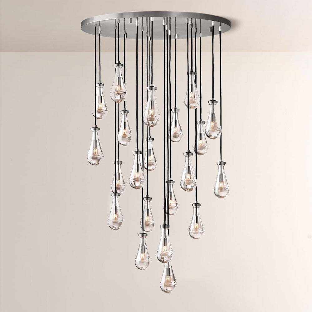 Much like the rhythm of a rainstorm itself. Suspended from slim black cords, drops of blown glass encase the bulbs – creating the illusion of underwater illumination – and cast luminous ripples that wash across ceilings and walls.
