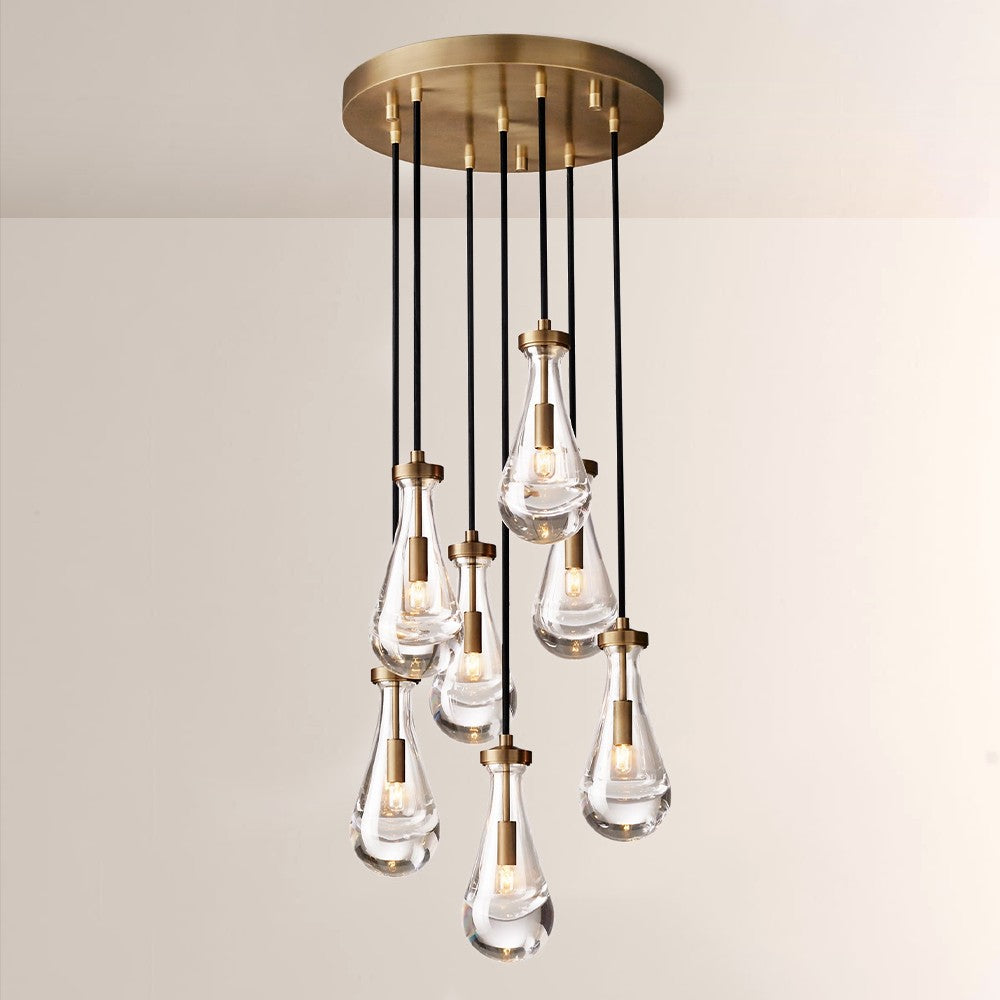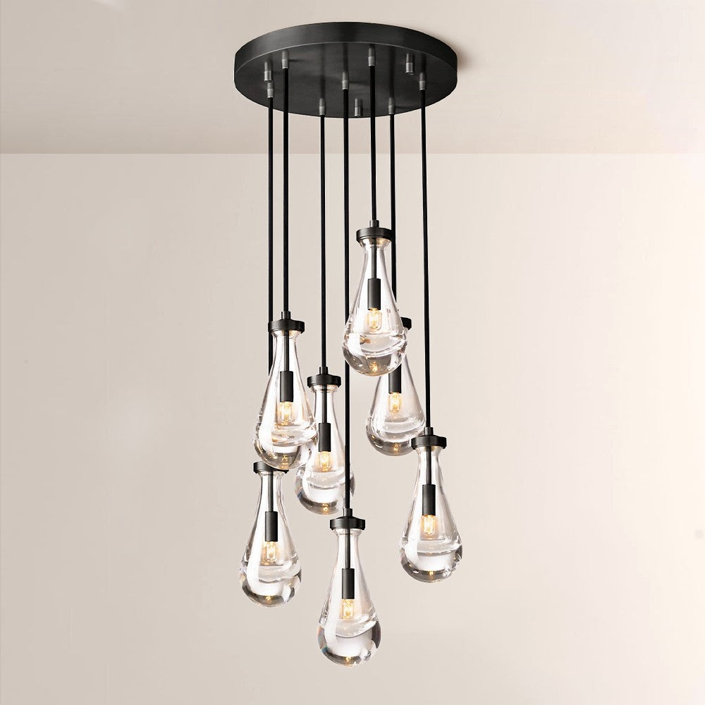 Much like the rhythm of a rainstorm itself. Suspended from slim black cords, drops of blown glass encase the bulbs – creating the illusion of underwater illumination – and cast luminous ripples that wash across ceilings and walls.