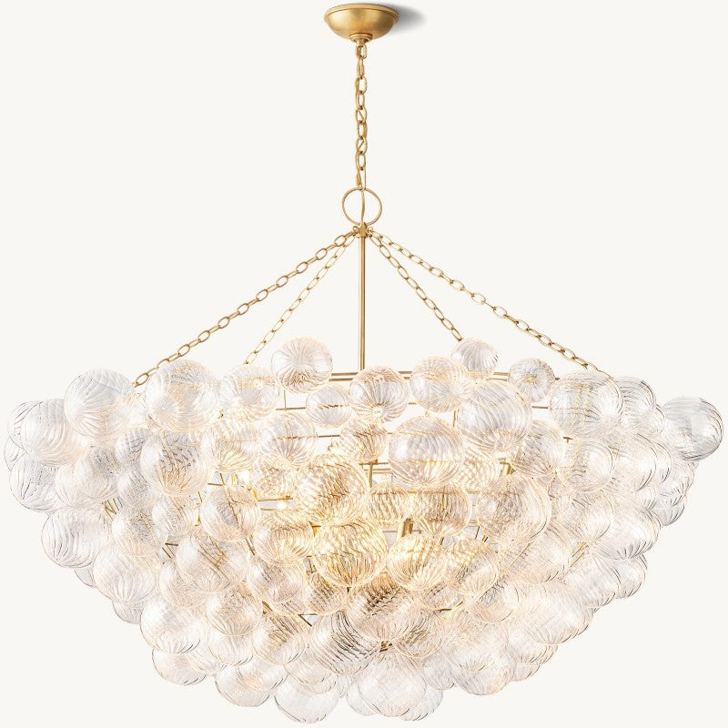 The Safidiya chandelier features a cluster of 27 blown swirled-glass orbs that appear weightless, floating like bubbles around a metal frame, reflecting ripples of light through the richly textured surface. Designer Julie Neill reimagines classic glass globe fixtures to create this elevated collection of distinctly modern statement pieces.