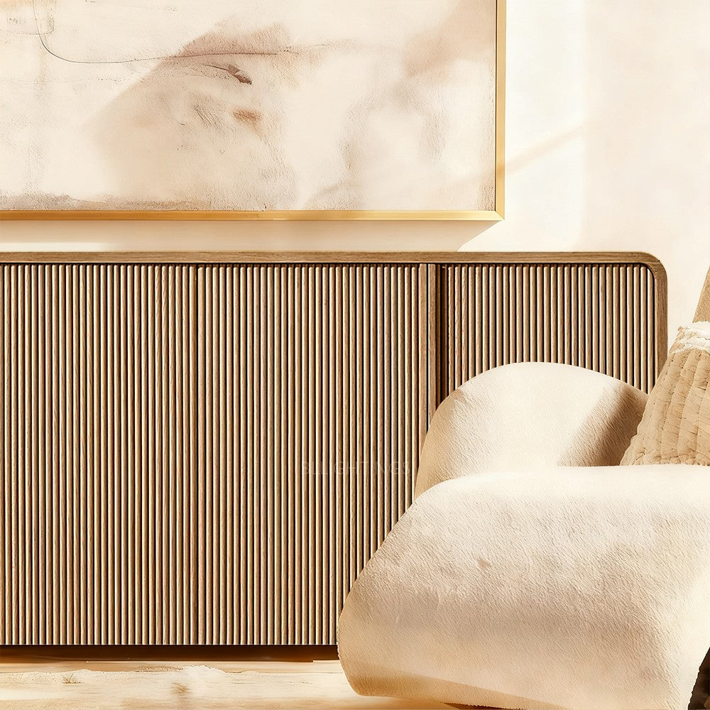 The door fronts are adorned with solid American white oak reeding, adding a touch of elegance and sophistication to the design.
