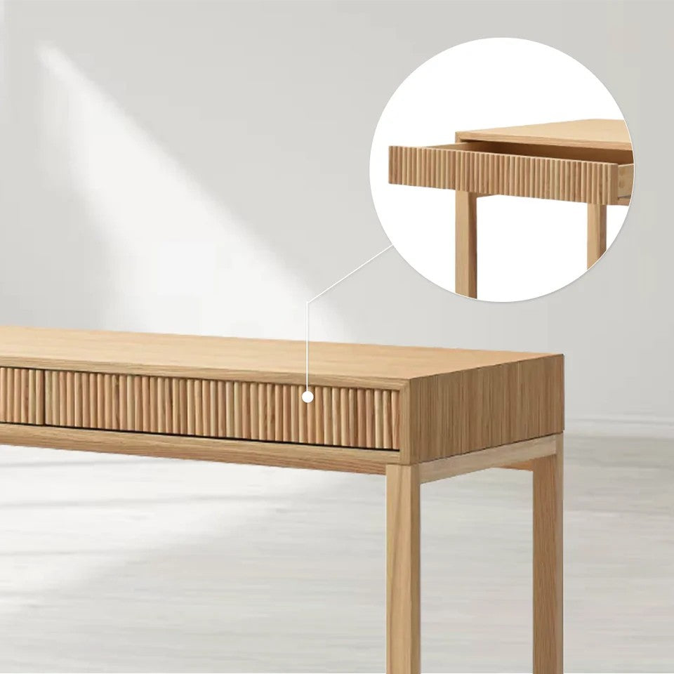 • The Desk is a contemporary piece that artfully blends Scandi influences with a coastal, relaxed vibe, making it a stylish addition to any home office or study. Its ash oak veneer finish imparts a natural and light feel, while the ribbed front detailing adds a touch of texture and sophistication. The desk features two generous-sized drawers, providing ample storage for office essentials, and its 1.4m width and 60cm depth offer a spacious work surface. This combination of functional design and aesthetic appeal ensures the Desk is both practical and visually pleasing, perfect for creating a serene and productive workspace.