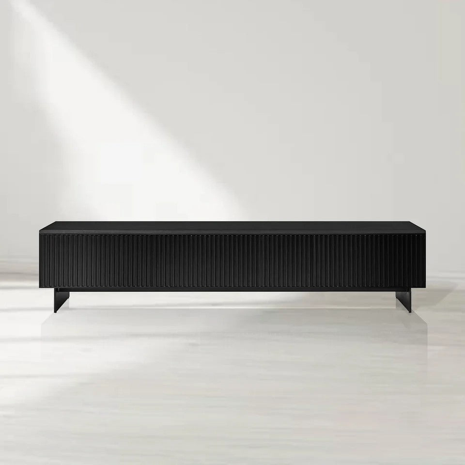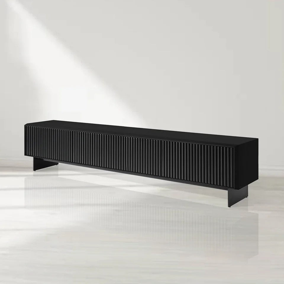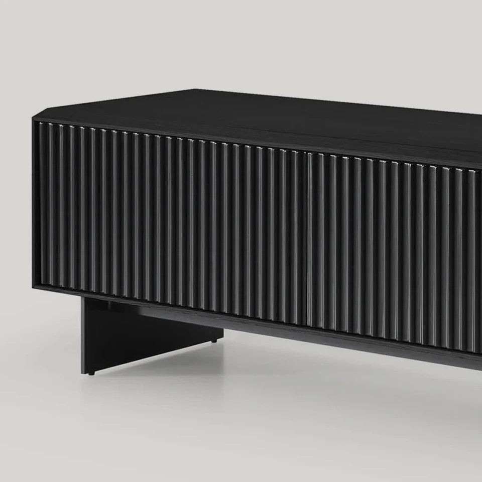 • The TV Unit is a harmonious blend of classic design with a modern twist, making it a standout piece in any living space. Its timeless shape is complemented by a contemporary touch, featuring ribbed detailing on its doors, adding texture and character to the design. Supported by understated legs, it maintains a sleek and unobtrusive appearance. The combination of black oak and black lacquer finish adds a sense of opulence while providing a striking contrast. With a generous length of 2.4 meters, the TV Unit not only serves as a stylish focal point but also offers ample storage space, making it a functional and aesthetically pleasing addition to your home.