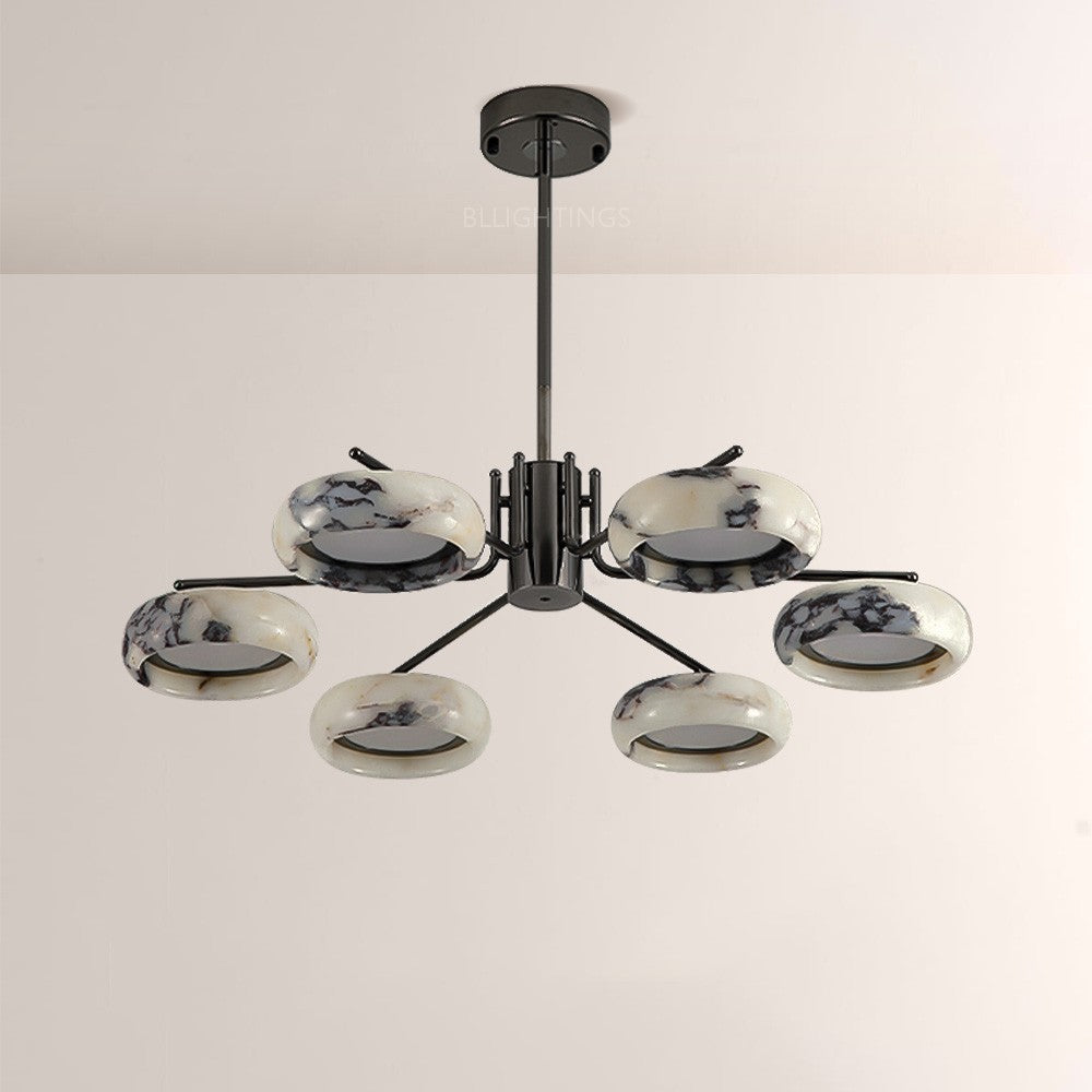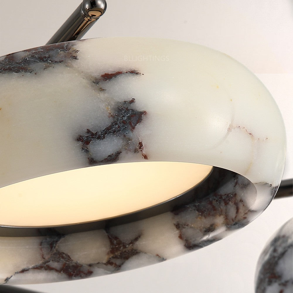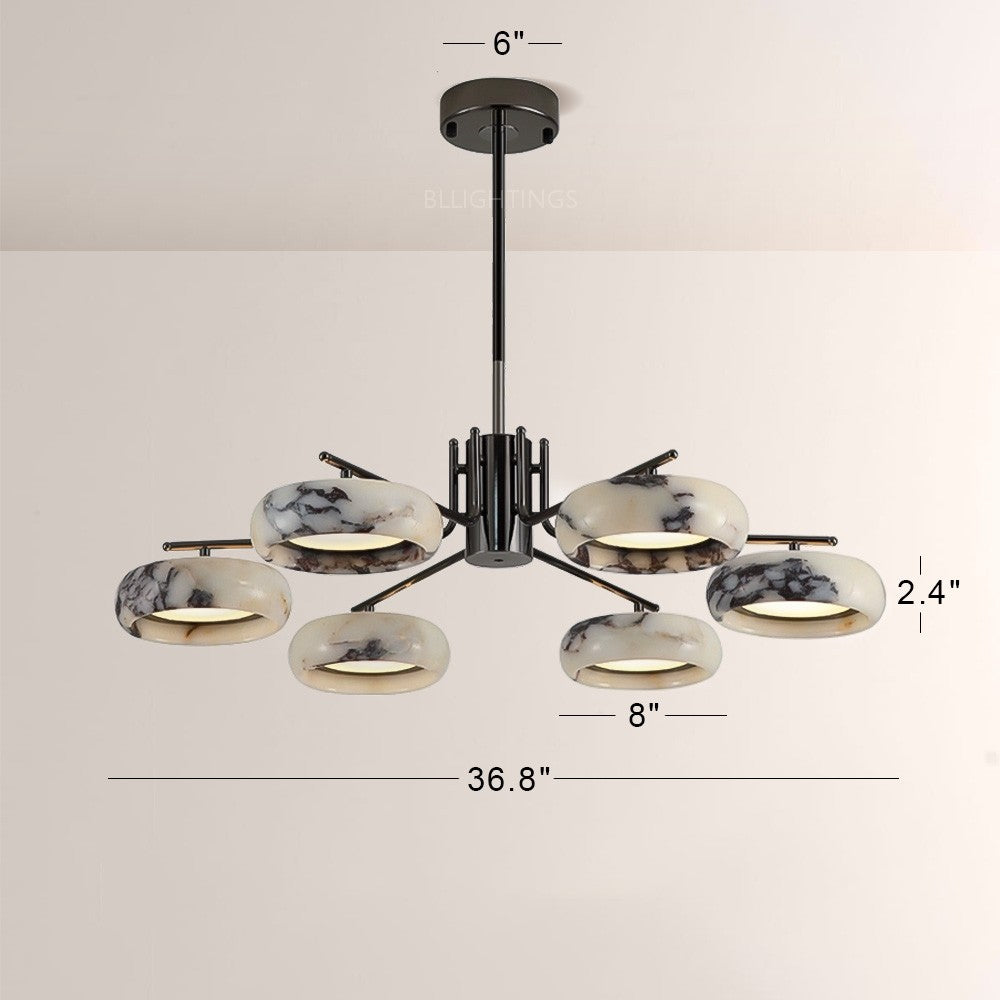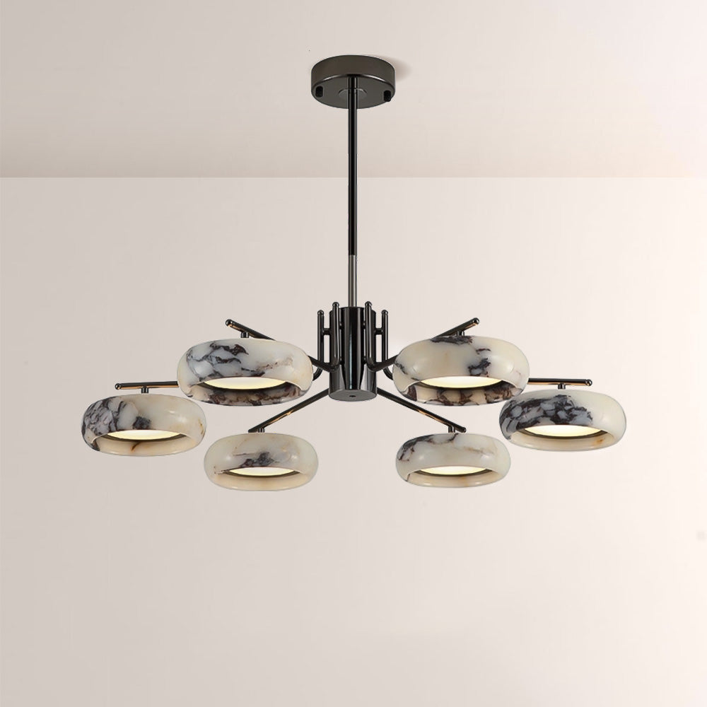 The Collins Multi-Ring Marble Chandelier features 5 marble-effect glass ring shades set on a sleek matte metal frame. Its radial-branch design casts warm, layered light—perfect for elevating high-end American dining rooms, living rooms, or open-concept spaces.