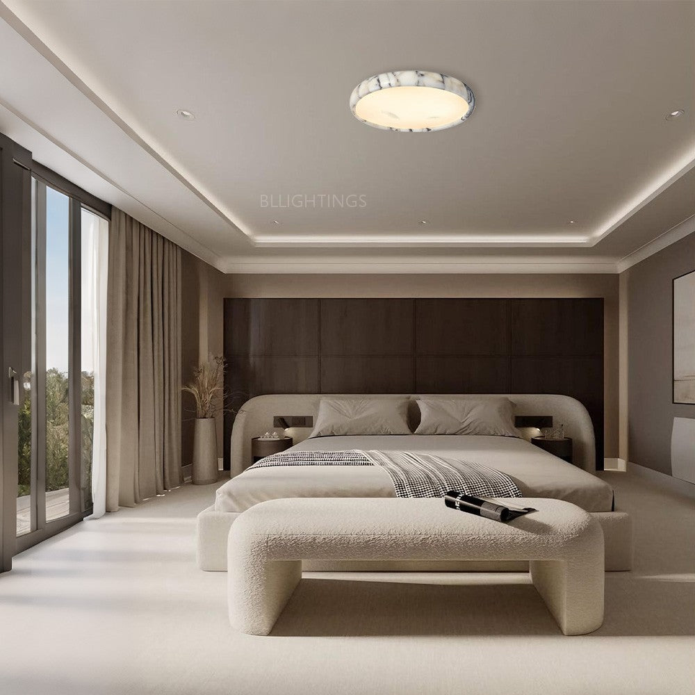 The Larkin Marble-Rim Oval Flush Mount showcases a refined marble-effect glass border paired with a frosted diffuser. Its elegant oval silhouette casts soft, ambient light—perfect for adding subtle luxury to high-end American bedrooms, living rooms, or hallways. The slim profile integrates smoothly with modern interiors.