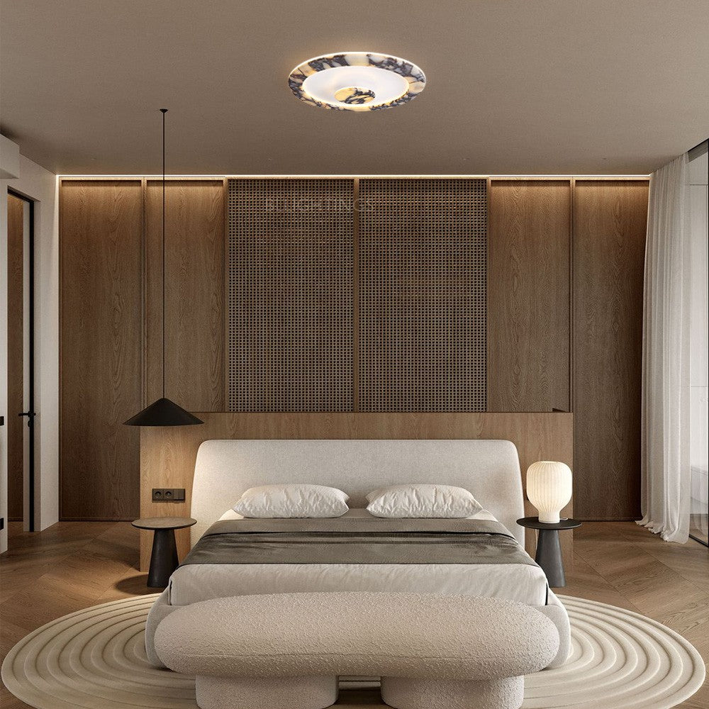 The Larkin oval flush mount features a dual-layer marble-effect glass frame paired with a frosted diffuser. Its sleek, layered oval design casts warm, soft light—ideal for elevating high-end American bedrooms, living rooms, or hallways. The compact profile fits seamlessly into modern luxury spaces.