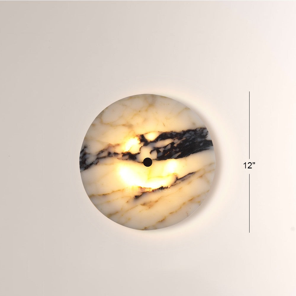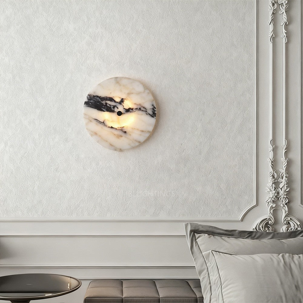 The Murray Flush-Mount Disc Marble Wall Sconce features a full-marble-effect glass disc shade with a discreet black center switch, mounted flush against the wall. Its sleek, low-profile design casts a warm, soft diffused glow.