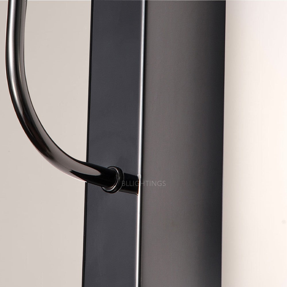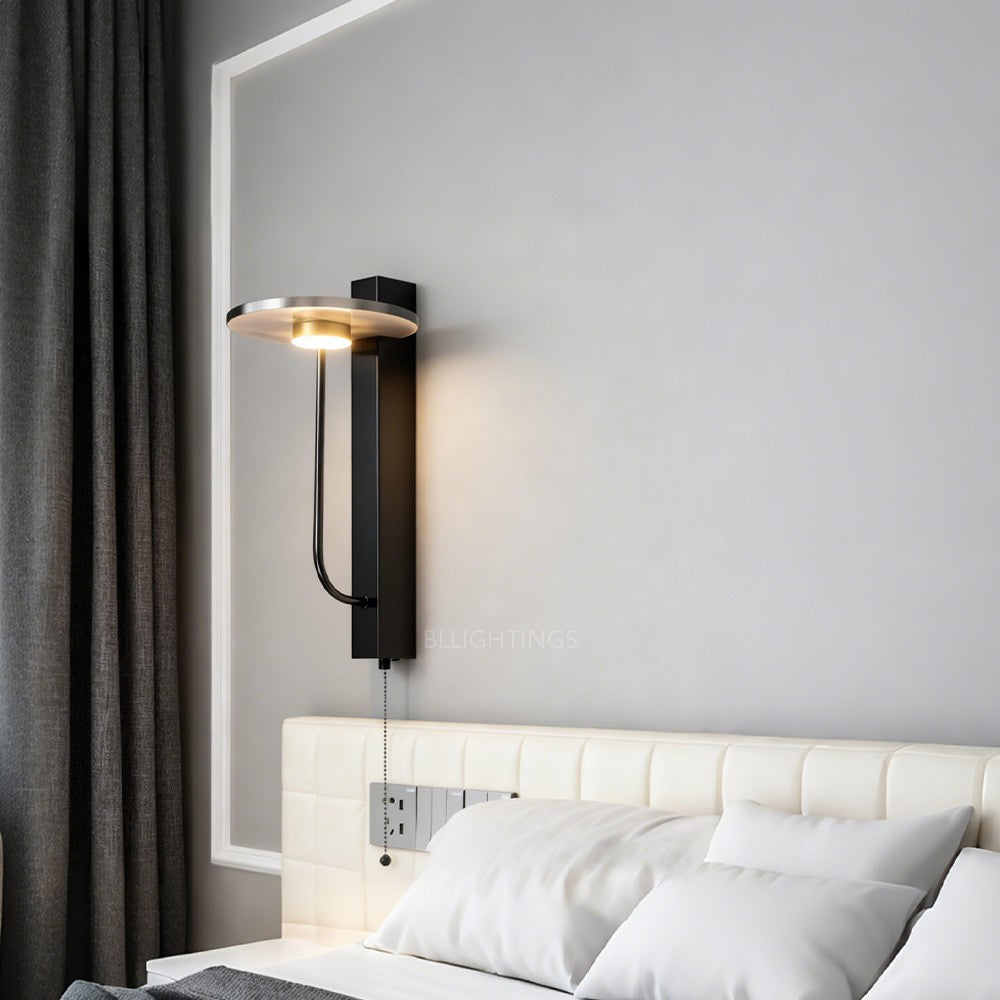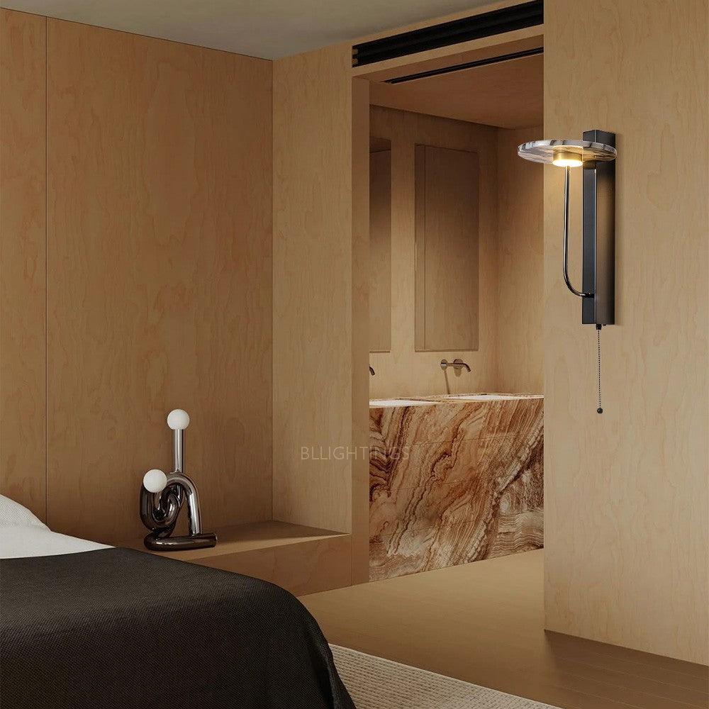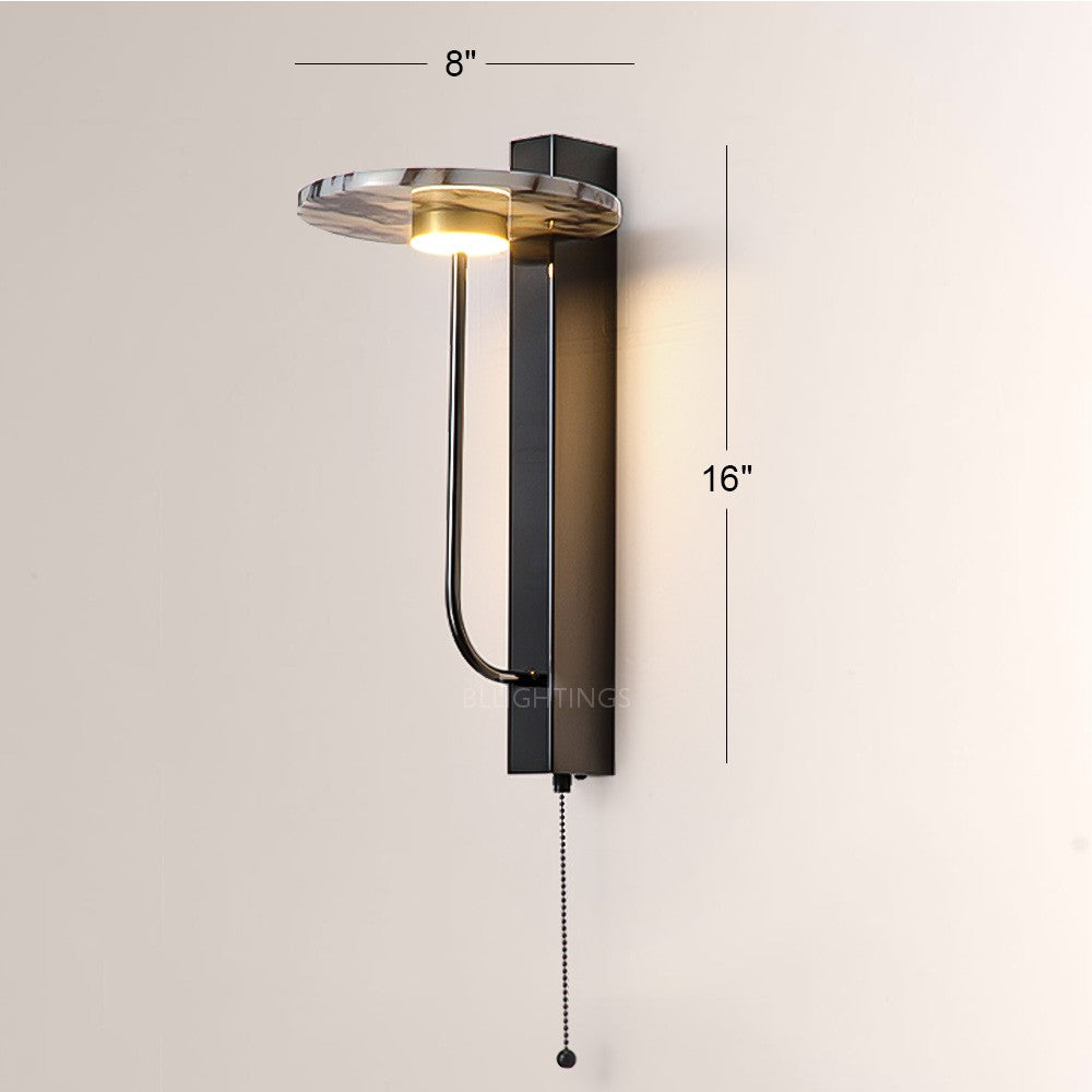 The Murray Linear-Mount Disc Marble Wall Sconce features a sleek marble-effect glass disc shade paired with a matte black vertical linear mount and curved metal arm. Its modern vertical design casts warm light both upward and downward.