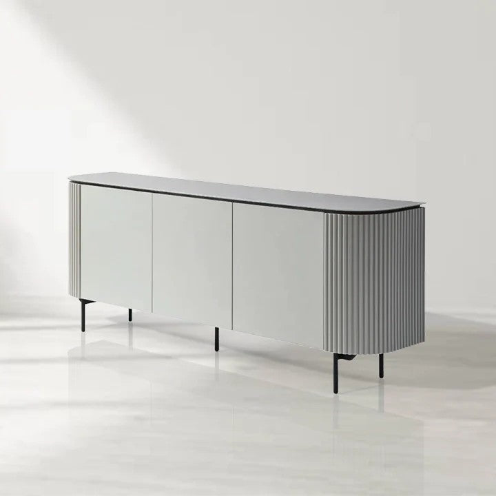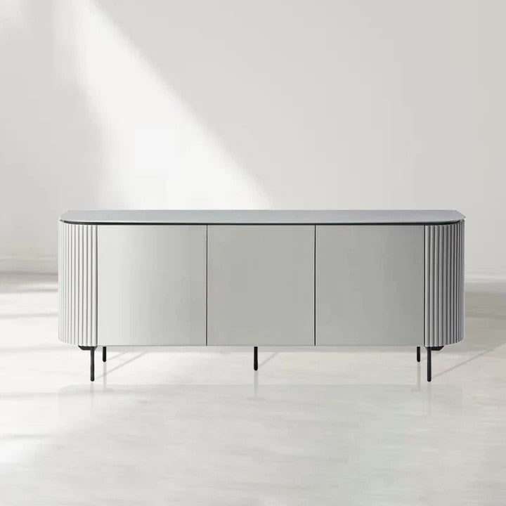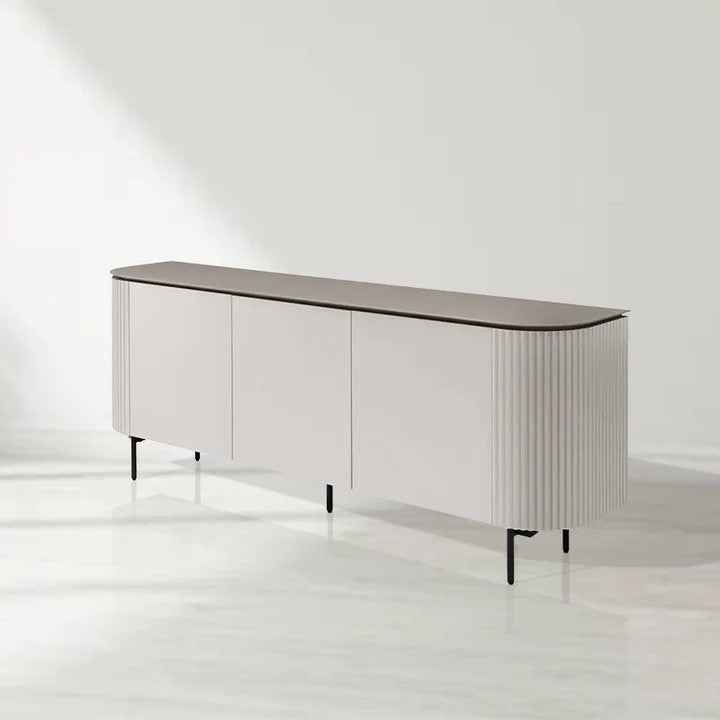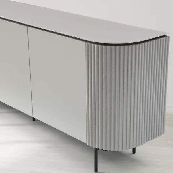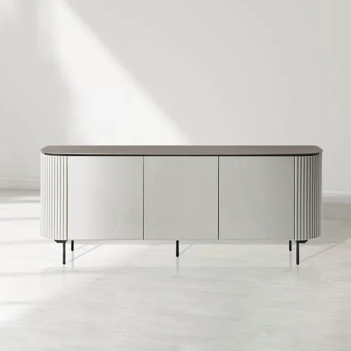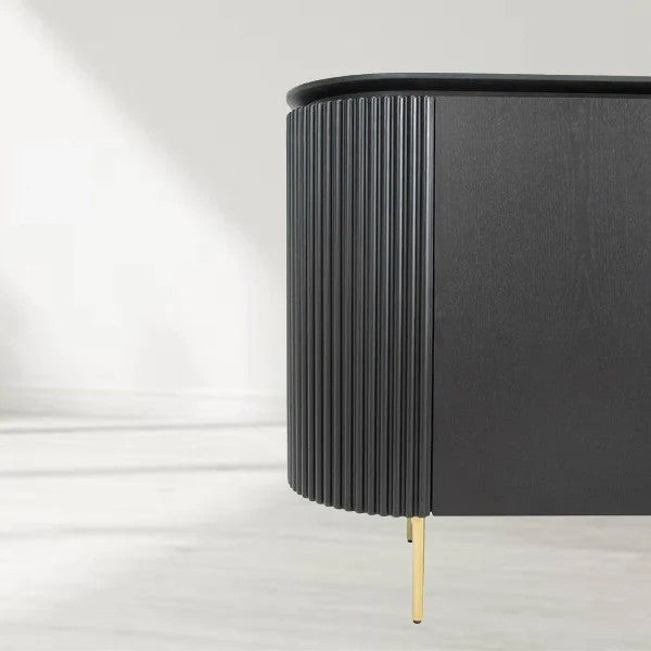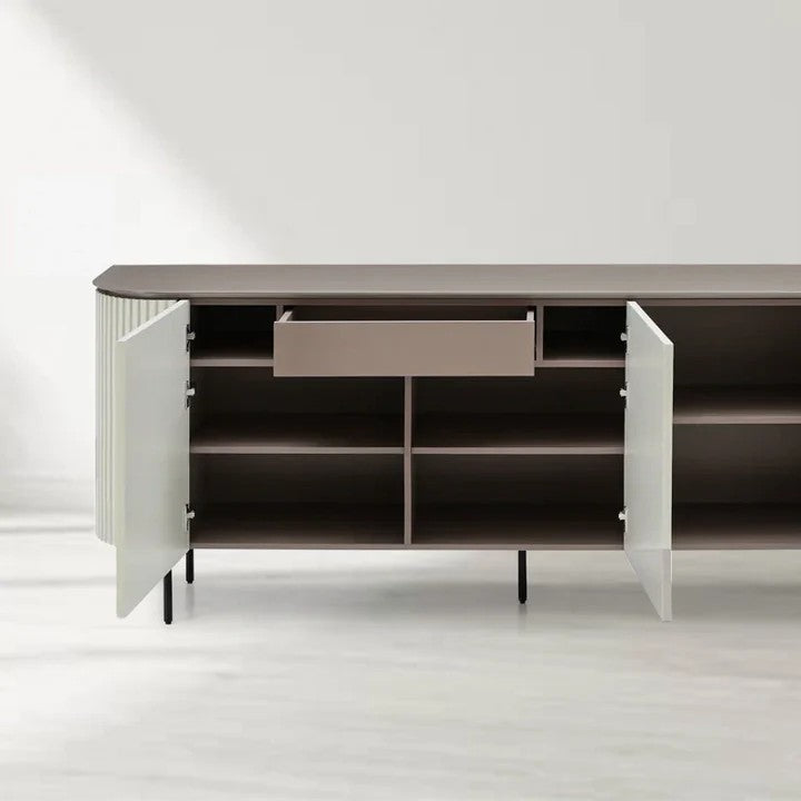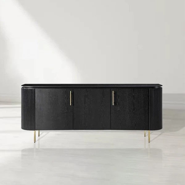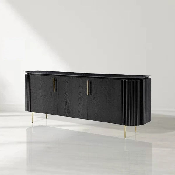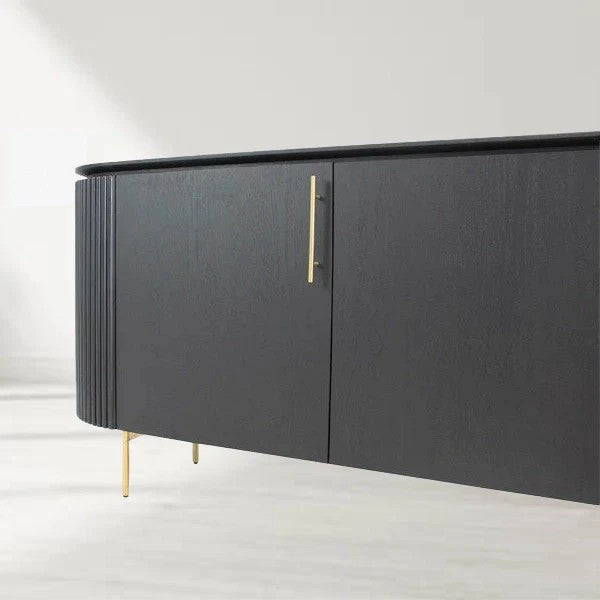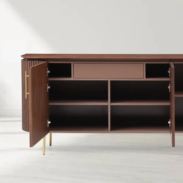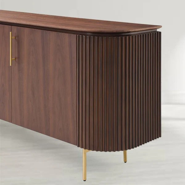• Add a touch of luxury to your home with the Nantie Buffet. Crafted from rich walnut and accented with elegant brass legs and handles, this contemporary piece exudes refined sophistication. The ribbed detailing on either end enhances its striking design, making it a standout addition to any dining or living area.