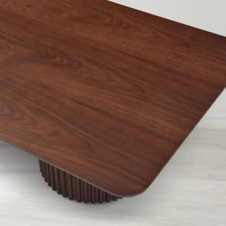 • The Lantine Coffee Table exudes a warm, inviting charm, perfect for contemporary living spaces. Showcasing a sophisticated walnut veneer finish, this coffee table is an elegant addition to any interior. The ribbed double pedestal base adds depth and character, further enhanced by a striking brass ring at the base for a touch of refined luxury.