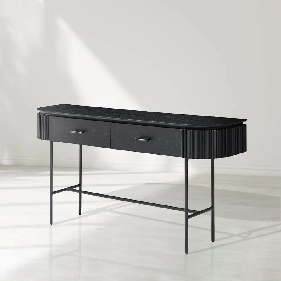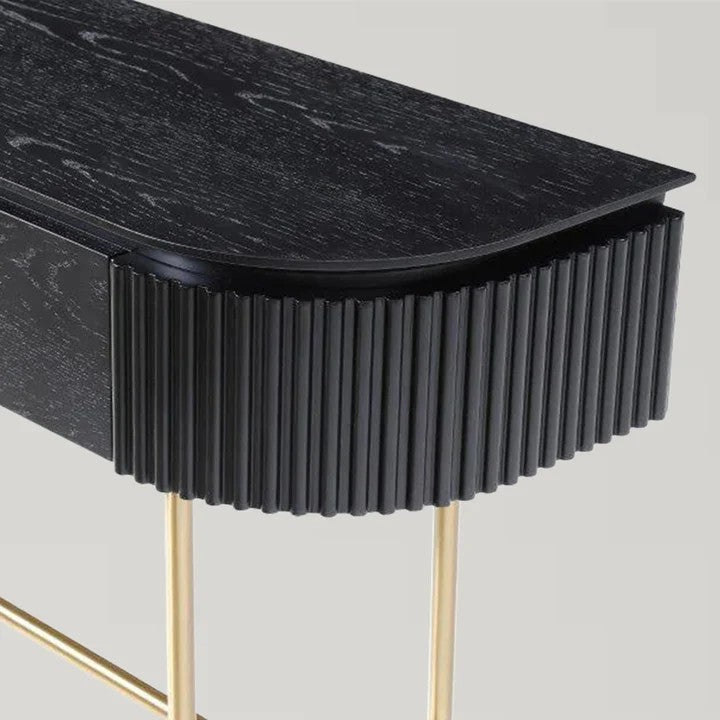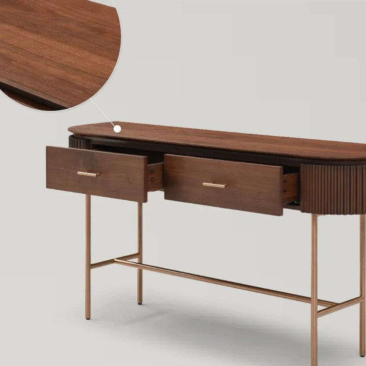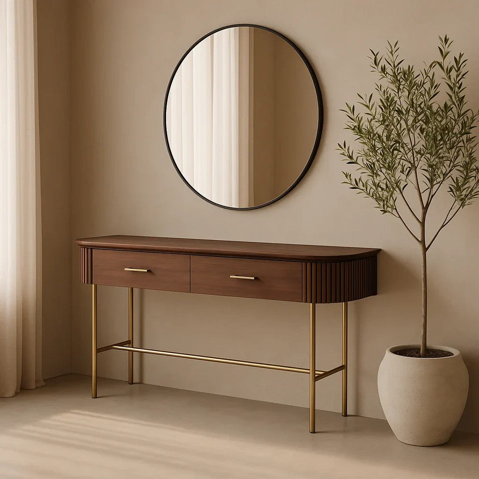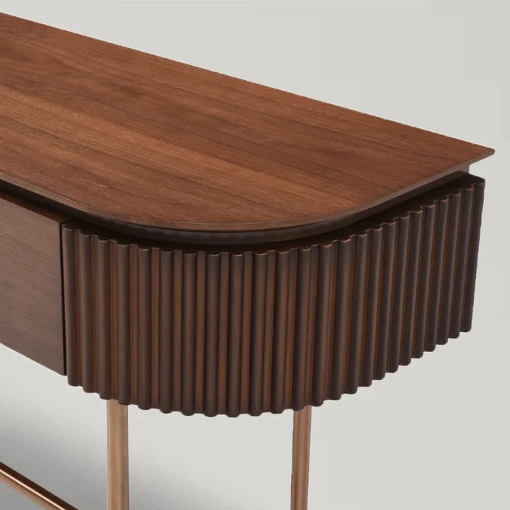 • A perfect fusion of style and functionality, the Lantine Console is a sophisticated addition to any interior. The ribbed end detailing introduces texture and depth, while the walnut veneer finish exudes warmth and timeless elegance.