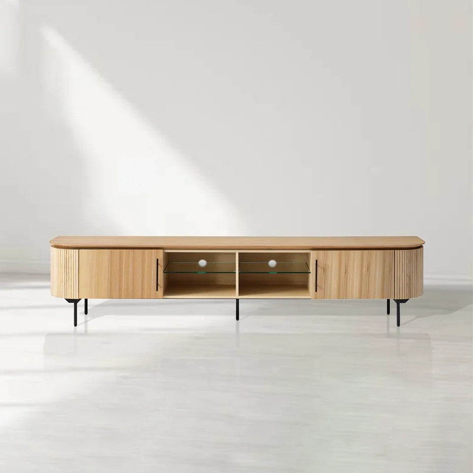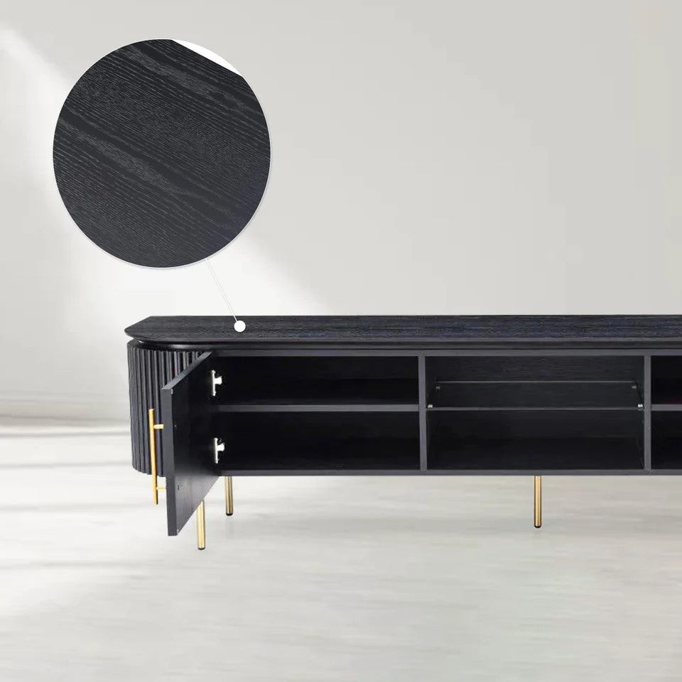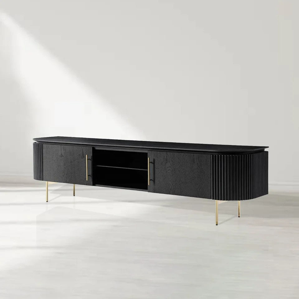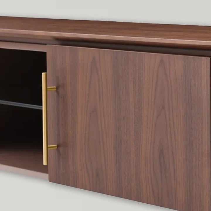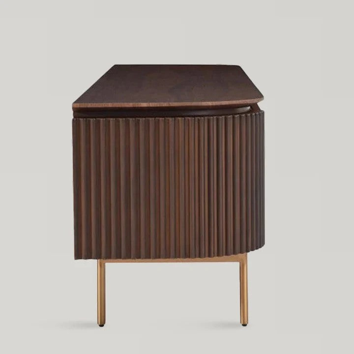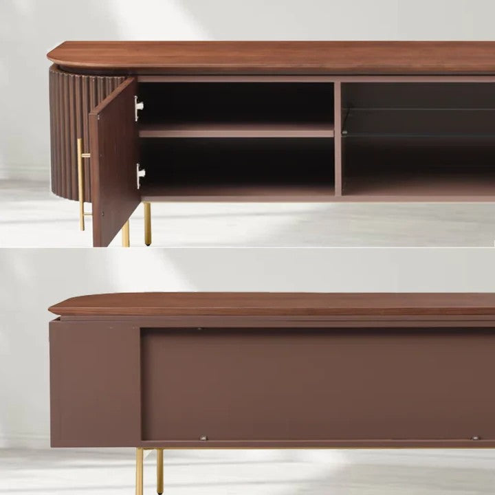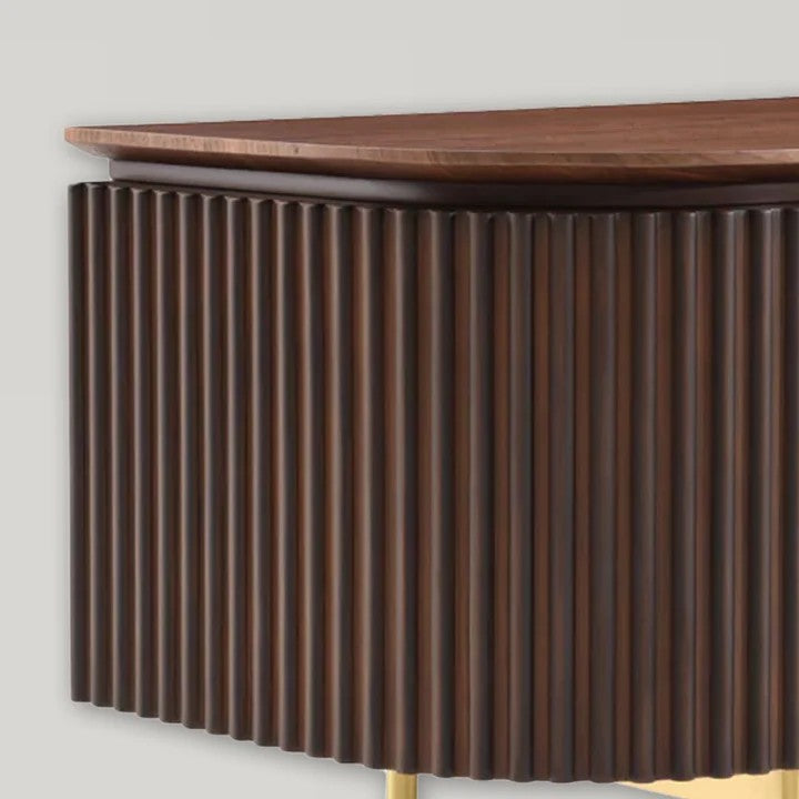 • The Nantie TV Unit captivates with its stunning walnut finish, exuding natural beauty and warmth. The rich walnut veneer not only enhances its luxurious appeal but also ensures durability, making it a lasting investment for your living space. The ribbed end panels create texture and depth, adding a refined touch to the overall design.