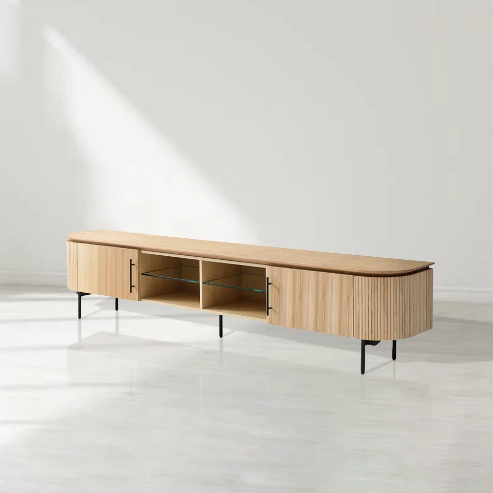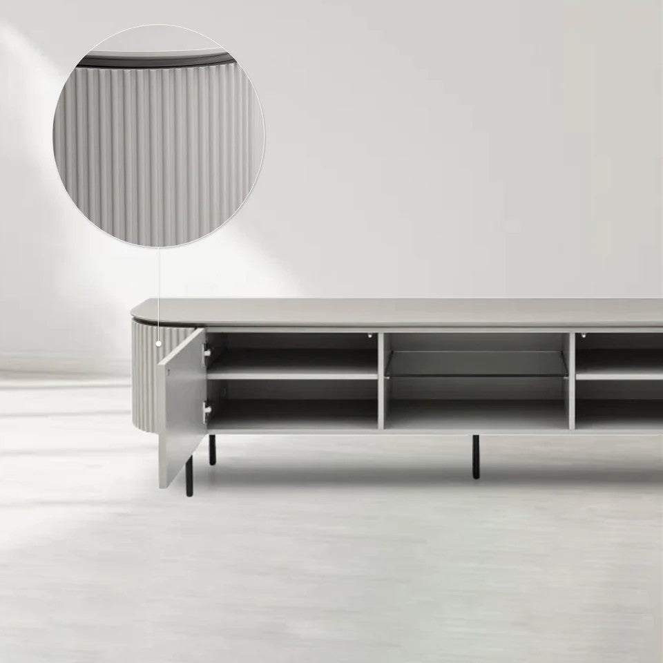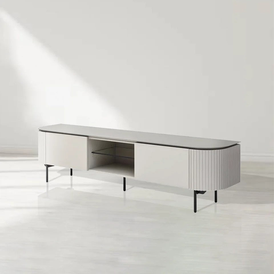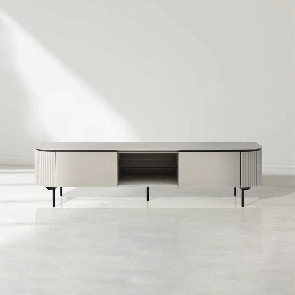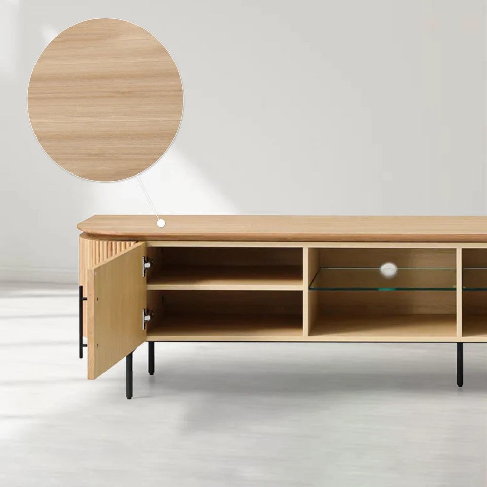 • The Nantie TV Unit captivates with its stunning walnut finish, exuding natural beauty and warmth. The rich walnut veneer not only enhances its luxurious appeal but also ensures durability, making it a lasting investment for your living space. The ribbed end panels create texture and depth, adding a refined touch to the overall design.