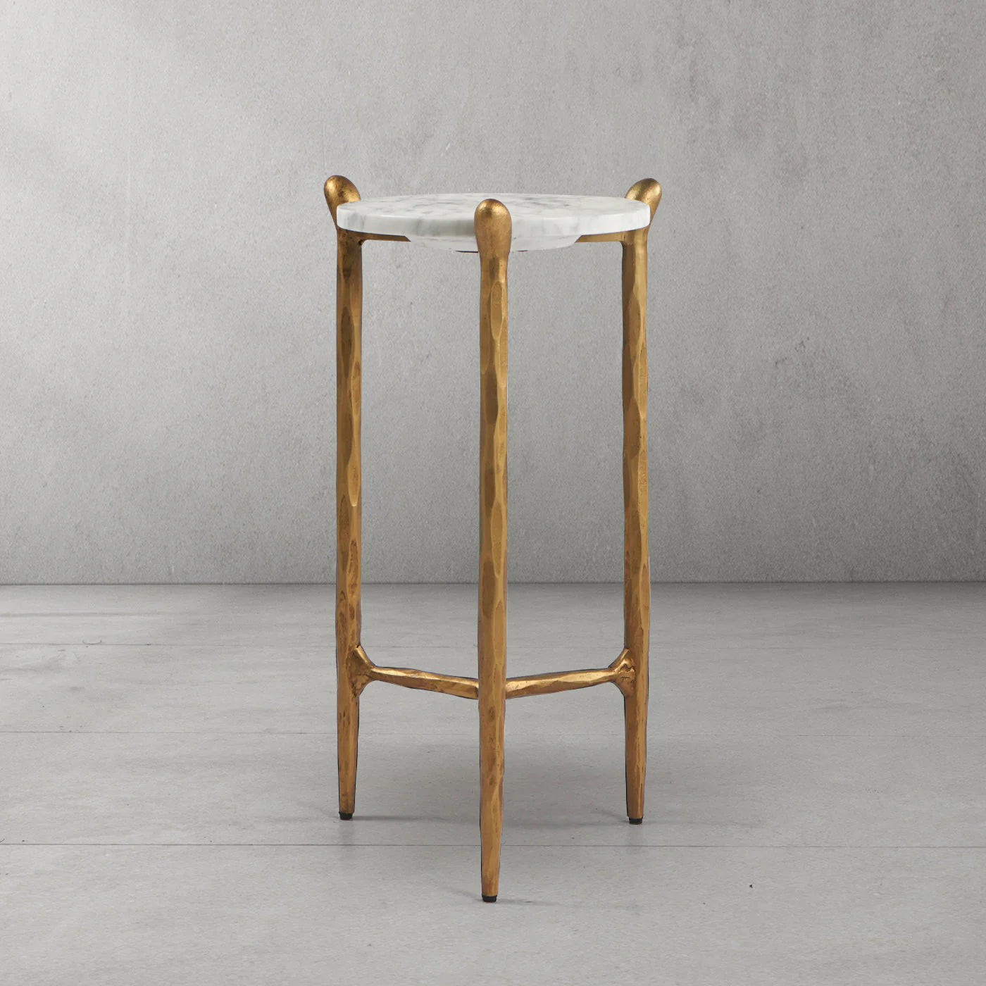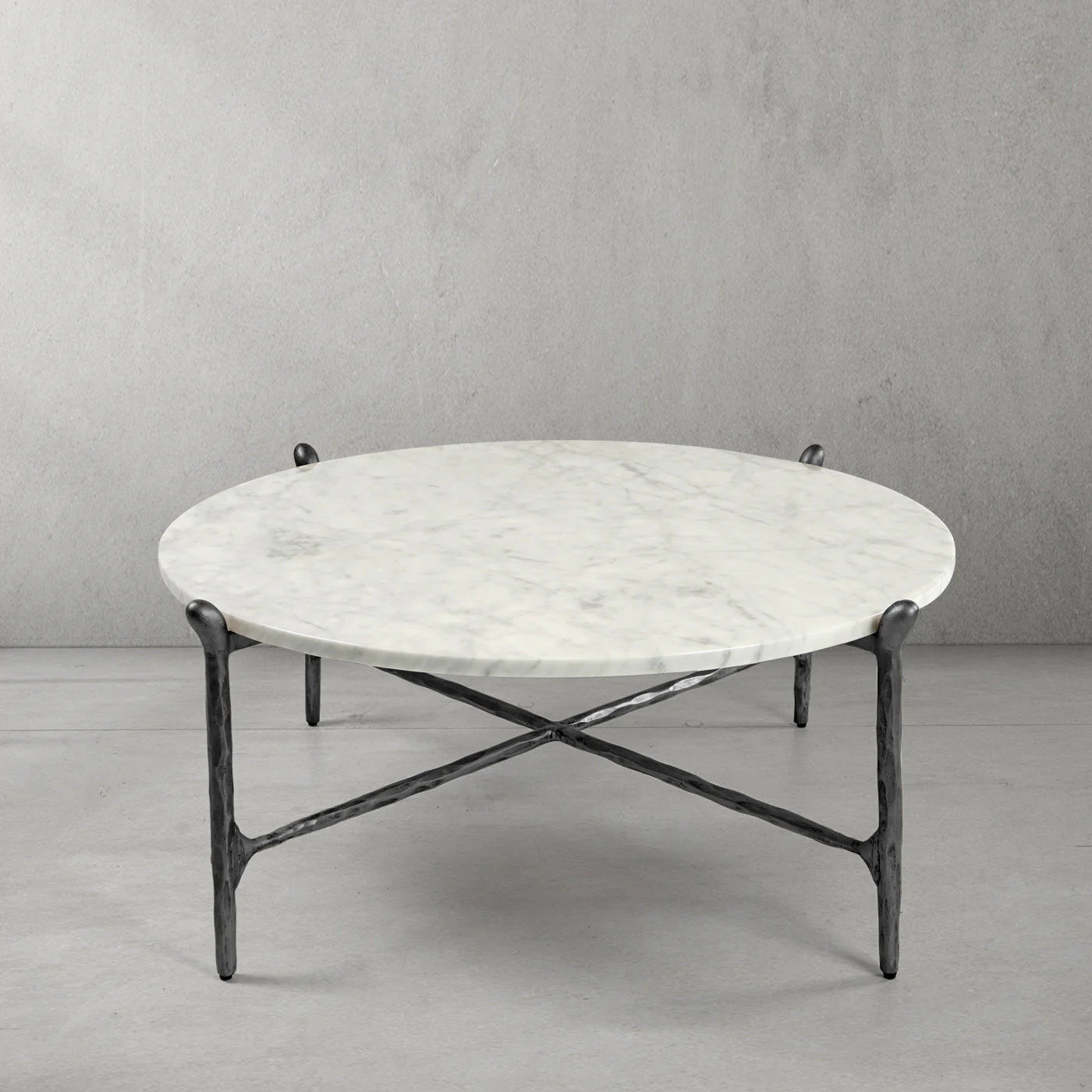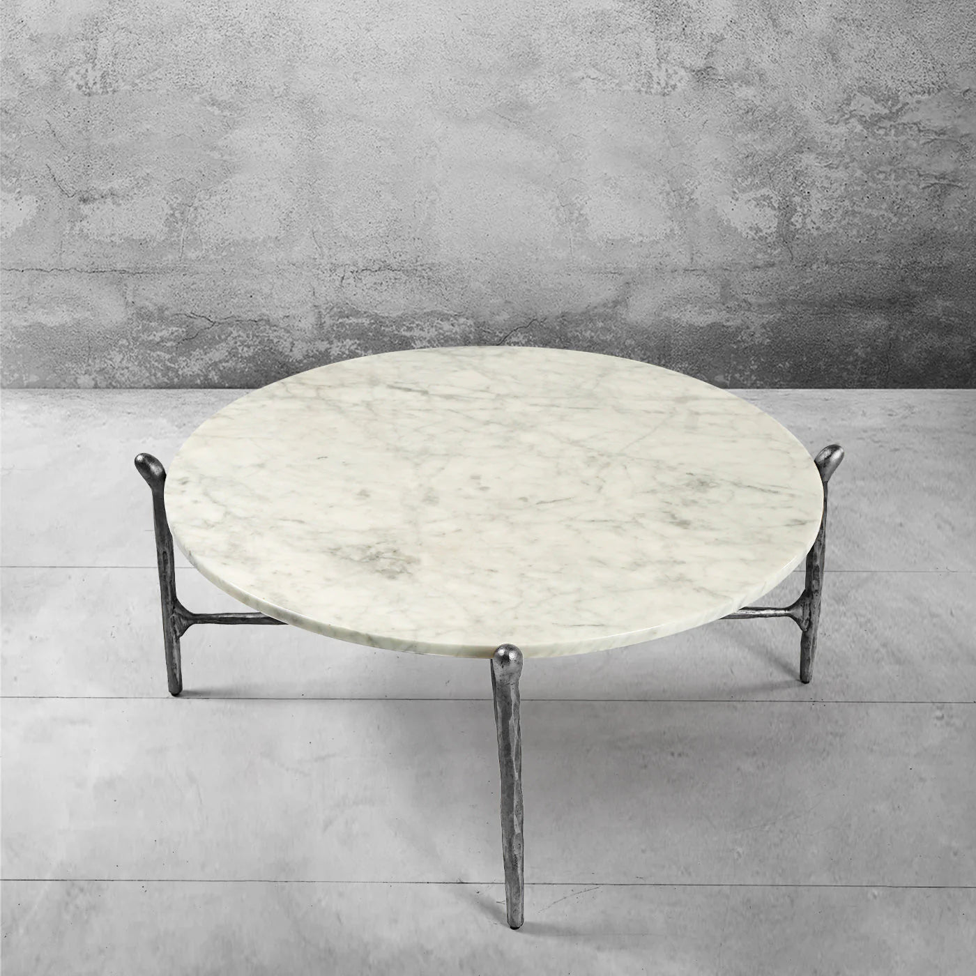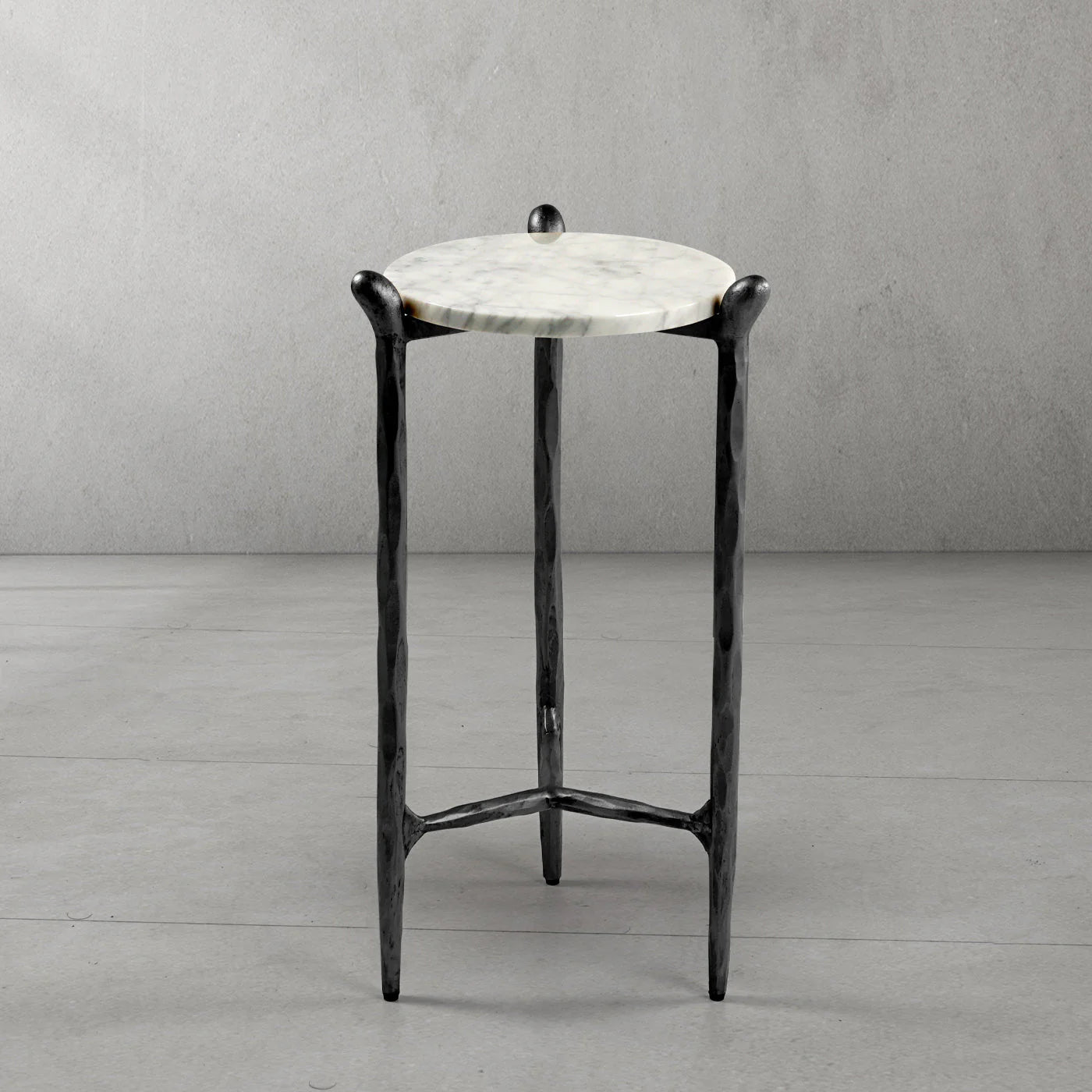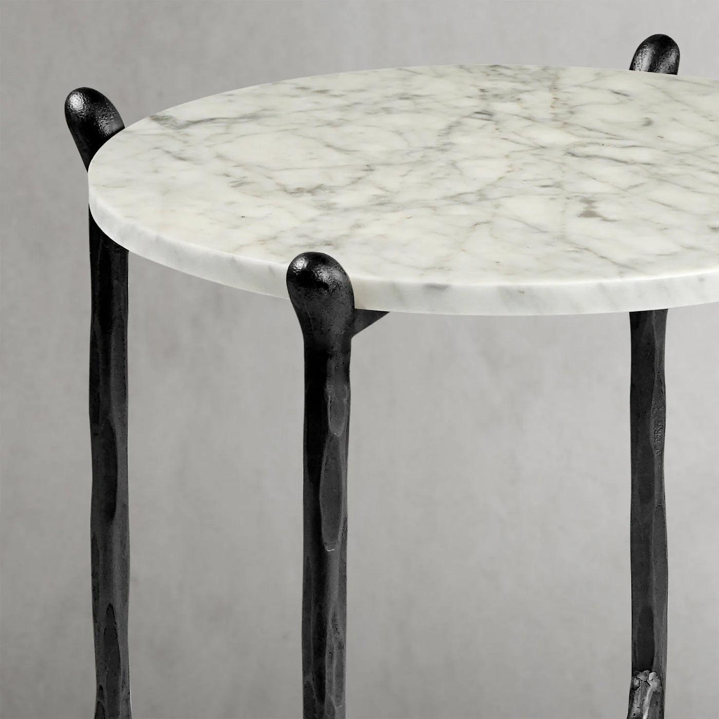 Our hand forged metal with marble collection. Using an age-old production process, artisans hand-hammer metal strips to reveal vibrant, imperfect, organic textures. The hammered, tapered silhouette provides a rich contrast to the smooth, honed stone.- Tabletop crafted of 1"-thick marble over a wood core